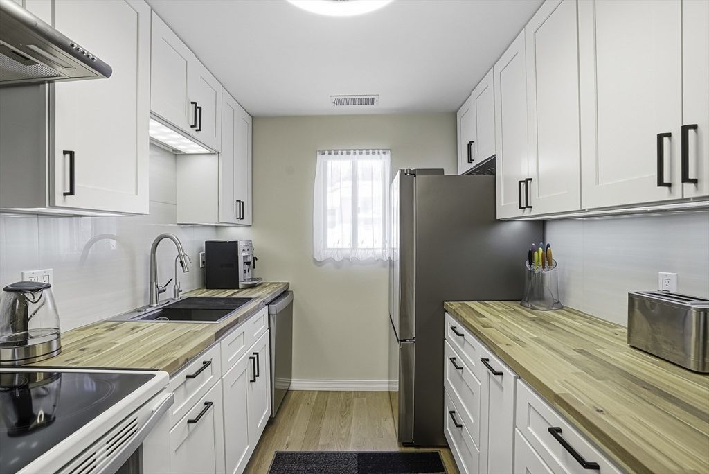 Rare opportunity in sought-after Natick Village! Beautifully updated townhome-style unit, move-in ready and full of charm. The kitchen features ceiling-height cabinetry, butcher block countertops, custom tile backsplash, and a black-framed sliding door. Engineered wood floors flow throughout the bright, open living and dining areas and continue upstairs, while solid wood interior doors add quality and character. Private fenced patio perfect for relaxing or entertaining. Upstairs offers two spacious bedrooms and a beautifully updated full bath. Newer heat pump adds energy-efficient heating and cooling. Community amenities include an in-ground pool, tennis and pickleball courts, fitness room, EV chargers, and nearby laundry. Easy access to the commuter rail and minutes to downtown Natick with quick access to Boston.