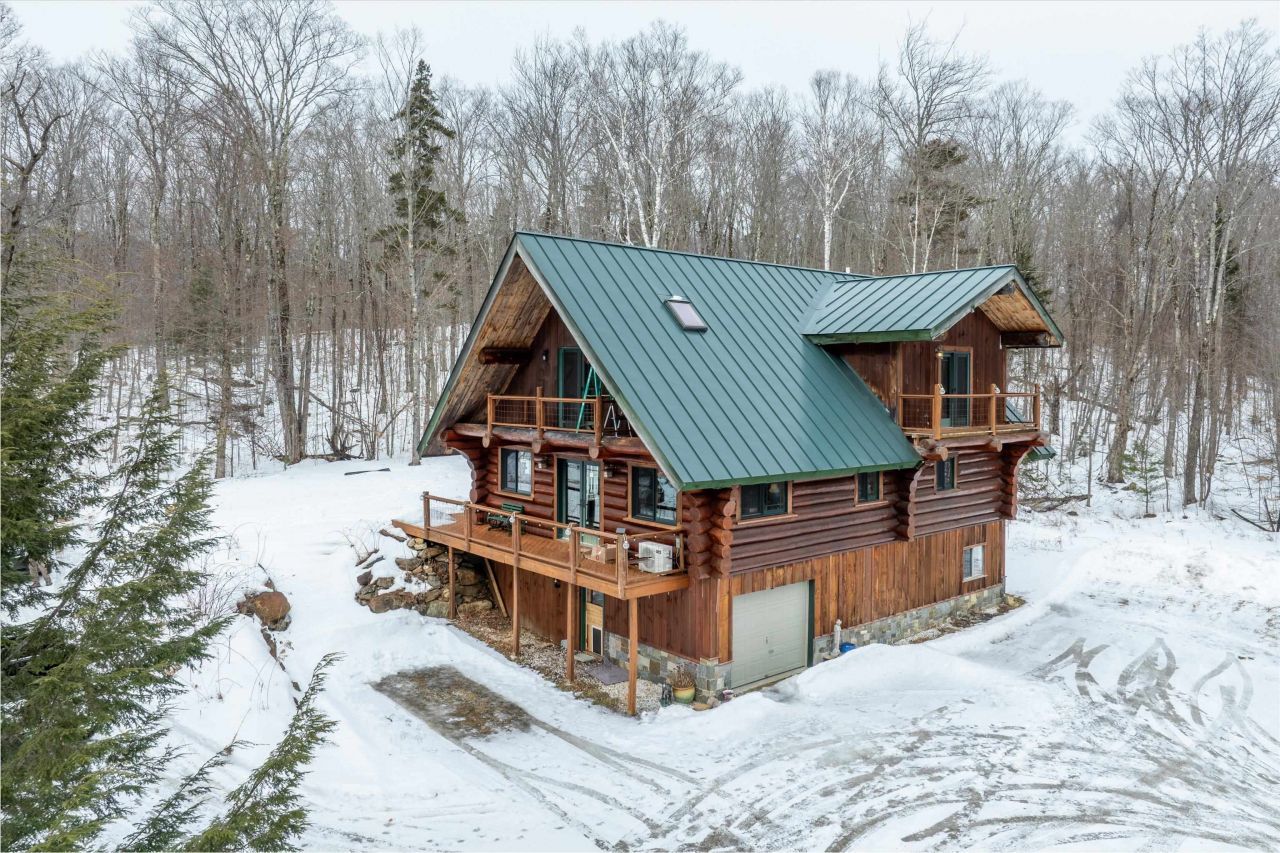 Exceptional log home privately set on 14+ wooded acres above a gentle, meandering stream adjoining the Green Mountain National Forest. This special retreat offers three spacious bedrooms, including a main-level primary suite, and two second-floor bedrooms with a shared full bath. The main level features a cozy, light-filled family room, a generous dining area with a coffee bar and a well-appointed kitchen with abundant cabinetry, storage, and breakfast bar. The main-floor laundry area and half bath complete this level. Step outside to the wraparound deck, accessible from the family room to the covered front porch and from the dining area to the side deck overlooking the stream. The second-level loft provides a comfortable living and entertaining space overlooking the main-floor family room, along with a built-in desk/workspace and an art studio area with slider access to a private deck overlooking the woods and stream. All three bedrooms enjoy deck access and peaceful views. The full unfinished basement offers a one-car, tuck-under garage and endless potential. Are you looking for a workshop area, exercise room, second kitchen, or additional living space? What's your Vermont dream? Welcome home!!!