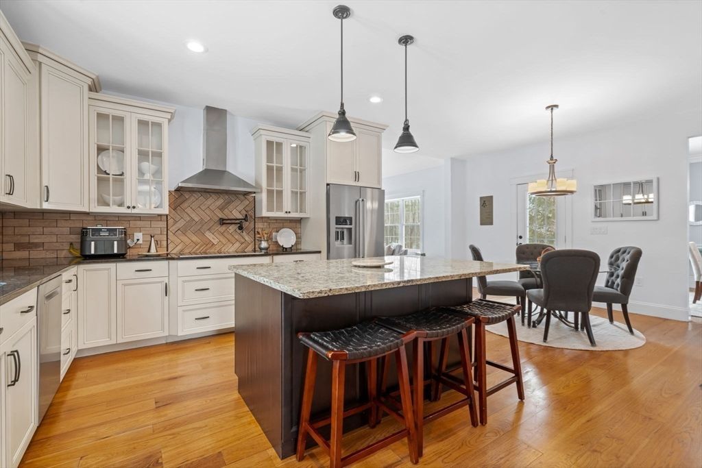 Custom built in 2014 & situated on an elevated 1.1 acres. Stunning 4 bedroom colonial built for modern living and suburban tranquility. Offering open concept living. A true gourmet kitchen featuring an induction cook top, pot filler, and a unique sliding barn door pantry, tiled back splash, granite counter tops and center island. The back to front living room boasts hardwood floors, cathedral ceiling, and a custom stone gas fireplace. A finished third floor serves as a perfect home office, craft room or multi generational living suite. Enjoy a newer 3 season porch, or the patio with a fire pit, all of this surrounded by professionally landscaped grounds that offer peace and privacy. Located in a quaint established Byfield neighborhood. Ideal commuter location close to RT 95, commuter rail and North Shore beaches.
