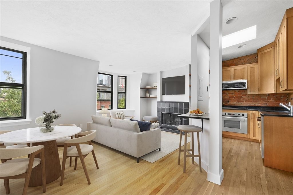 Available June 1st - Prime South End location at Back Bay's doorstep. Classic stoop on Dartmouth Street is just above Greystone Cafe and tree lined streets for the nicest Boston neighborhood vibe. One flight up is a private entrance to the unit and the entire top floor. The apartment has been brightly painted and the hardwood floors throughout are polished. Sweeping views of the city skyline. Exposed brick wall and decorative fireplace add so much charm and the high ceilings let in lots of light. Beautiful wood paneled kitchen with stainless steel appliances and an electric cooktop for easy cleaning. The primary bedroom has a wide closet and a sliding door to the tranquil back deck. Real second bedroom large enough for a queen sized bed. Clean tiled bathroom. Free shared laundry on the first floor. AC. Qualified applicants will have 700+ credit score & sufficient income. Pets negotiable. First / Last / Security Deposit required at lease signing