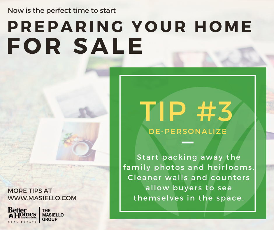 Start packing away the family photos and heirlooms. Cleaner walls and counters allow buyers to see themselves in the space.